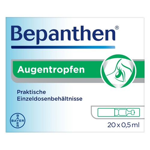 Wer an trockenen und gereizten Augen leidet, kann mit den Bepanthen® Augentropfen die Augenoberfläche befeuchten, den Tränenfilm stabilisieren und somit das Auge vor einem Trockenheitsgefühl schützen. Auf diese Weise wird eine Linderung der Beschwerden erreicht. Die Bepanthen® Augentropfen sind erhältlich als Ein-Dosis-Behältnis (praktisch für unterwegs) und in der Soft-Touch-Mehrdosisflache (insbesondere zur regelmäßigen Anwendung). Die Augentropfen enthalten weder Konservierungsstoffe noch Phosphate. Sie sind für Kontaktlinsenträger geeignet.