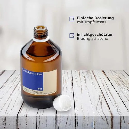 Das kolloidale Silber 100 ppm wird mit hochreinem destillierten Wasser unter qualifizierten Laborbedingungen frisch hergestellt und in einer dunklen Glasflasche geliefert. Die Herstellung erfolgt in der Apotheke unter überwachten Laborbedingungen. Das kolloidale Silber wird auf elektrolytischem Wege mit Hilfe eines entsprechenden Generators hergestellt. Dabei werden aus 99,99% reinem Silber kleinste Partikel gebildet und in destilliertem Wasser verteilt. Wir arbeiten dabei ohne Einsatz von Zusatzstoffen. Bitte beachten Sie: Kolloidales Silber ist kein Arzneimittel und daher auch ohne Angabe einer Indikation. Aus rechtlichen Gründen bieten wir daher das kolloidale Silber nur für technische Zwecke an. Nicht zum Einnehmen.