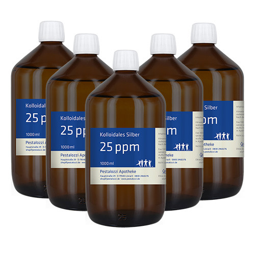 5 x 1000 ml "Kolloidales Silber - Pestalozzi Apotheke" in lichthemmender Apothekerbraunglasflasche