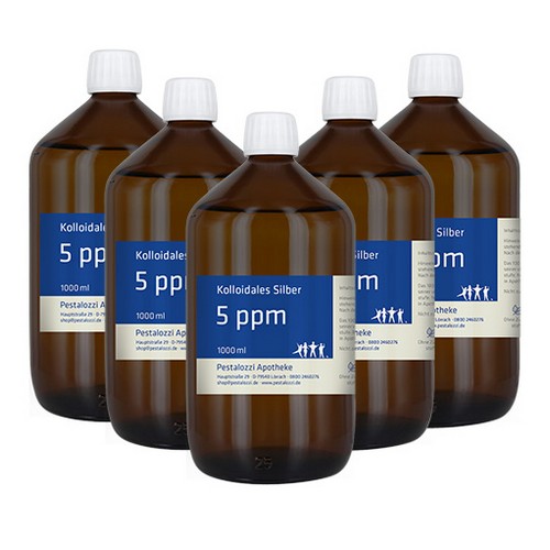 5 x 1000 ml "Kolloidales Silber - Pestalozzi Apotheke" in lichthemmender Apothekerbraunglasflasche