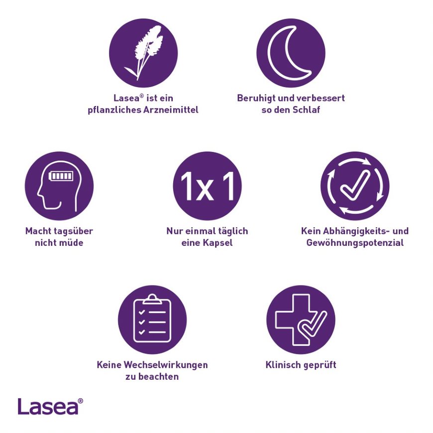 Lasea entfaltet seine pharmakologische Wirkung bereits vom ersten Tag der Einnahme an. Eine spürbare Wirkung tritt innerhalb weniger Tage ein. Die vollständige Wirksamkeit wird nach wenigen Wochen erreicht. Lasea verbessert als Folge der Beruhigung zunehmend die Schlafqualität. Diese Wirkung auf den Schlaf tritt also etwas verzögert ein.