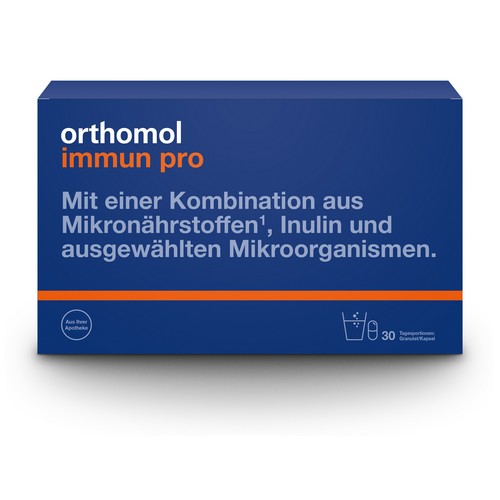 - Orthomol Immun pro enthält Kohlenhydrate, bei Störungen der Glucosetoleranz nur unter sorgfältiger Stoffwechselkontrolle verwenden. Die enthaltenen Kohlenhydrate (12,8 g pro Tagesportion) sind leicht verfügbar.