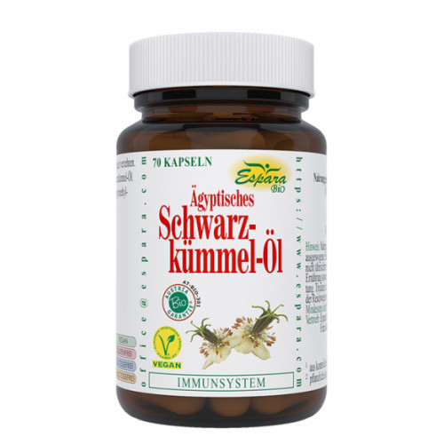 Nahrungsergänzungsmittel mit ägyptischem Schwarzkümmel-Öl aus biologischem Anbau.