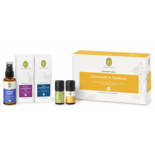 Ein Set aus bewährten Produkten der Aromapflege und Aromatherapie, um in gesundheitlich herausfordernden Zeiten Zuversicht zu schenken und das Wohlbefinden zu stärken. Produkte: Körper Entspannungs Öl bio, Haut Stärkungs Öl bio, Schlafwohl Kissenspray bio, Pfefferminze bio, Sommersonne Duftmischung, Aroma Sticks zum Selbstbefüllen und eine Broschüre.