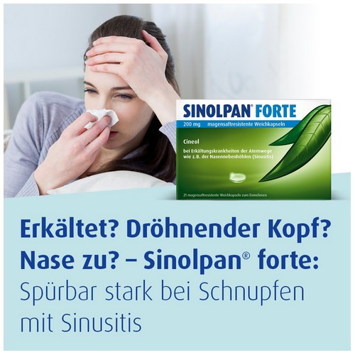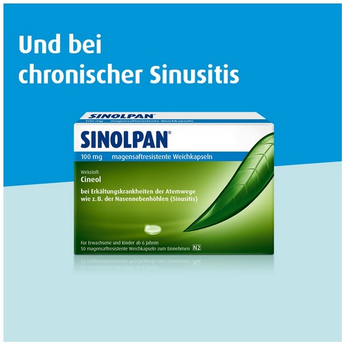 Sinolpan® 100 mg, Sinolpan® forte 200 mg magensaftresistente Weichkapseln, Wirkstoff: Cineol, Anwendungsgebiete: Zur Behandlung der Symptome bei Bronchitis und Erkältungskrankheiten der Atemwege. Zur Zusatzbehandlung bei chronischen und entzündlichen Erkrankungen der Atemwege z.B. der Nasennebenhöhlen (Sinusitis).