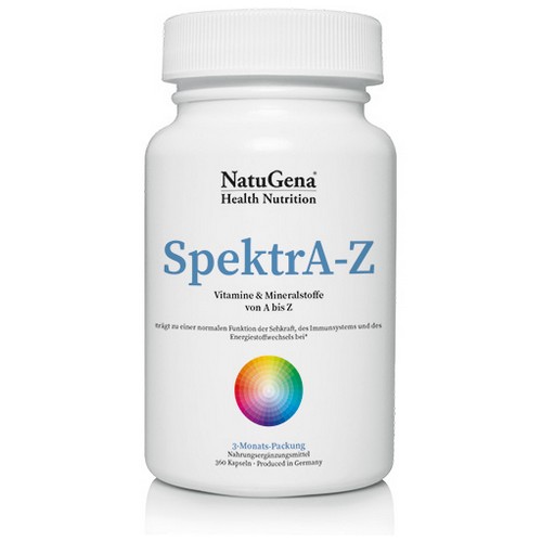 SpektrA-Z (3-Monats-Packung) bietet ein umfangreiches Spektrum an bioaktiven Vitaminen und organisch gebundenen Mineralstoffen, kombiniert mit den sekundären Pflanzenstoffen Lutein und Polyphenolen.