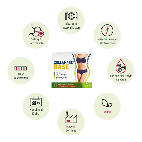 ZELLAMARE® BASE ist so entwickelt worden, dass es den Körper optimal beim Ausgleich des körpereigenen Säure-Basen-Haushalts unterstützt: